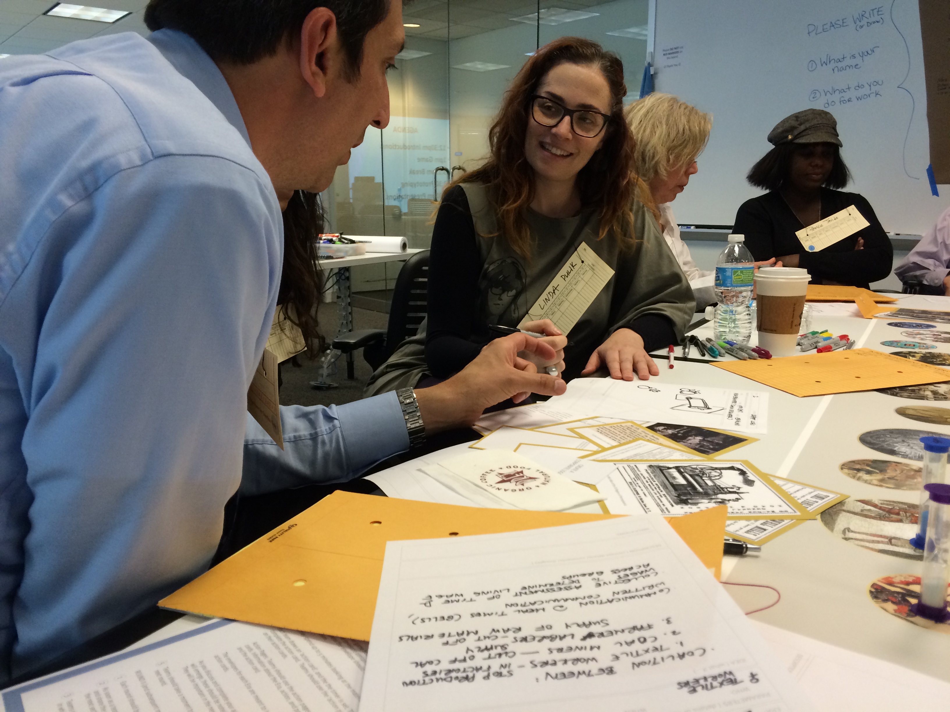 The day was structured in two parts. First, we drew inspiration from cultural probes, reflective design, meaningful play, and critical games to create a board game in which participants created imagined interventions into labor history. Players traveled across a game board that took the form of a timeline to engage with historical technologies throughout several eras. In ancient Greece, for example, they were presented with information about devices for measuring time such as the water clock; in the late industrial era, they examined the assembly line; in the present, they focused on technologies associated with the automated warehouse; and in the future, they played with ideas surrounding robots and artificial intelligence. Each turn, teams moved through time and were tasked with creative actions like “design a corporate logo” and “plan a collective action” within the designated time period and technology. Their particular space on the board provided them with a perspective from which to approach the task. They might, for instance, land on “child factory worker, England” in the era of the steam engine.