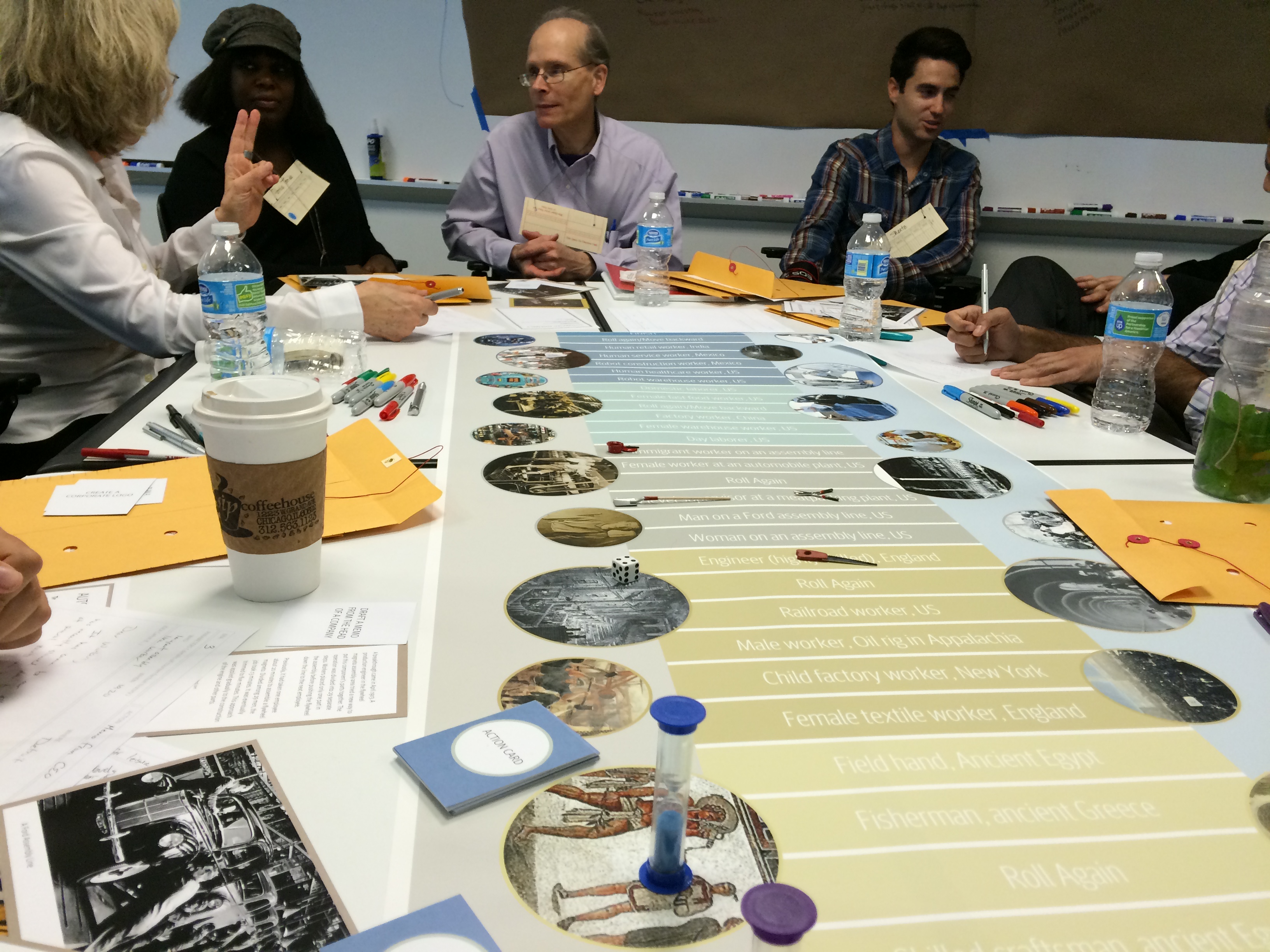 Teams gathered around a game board in the shape of a timeline that spanned almost 3000 years. The board was divided into 5 eras, and each era explored labor in terms of set of technologies.